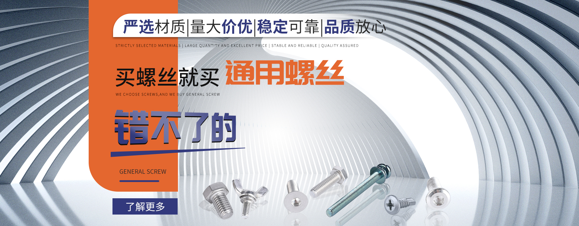 中山市通用螺絲制造有限公司成立于1987年,工廠坐落于廣東四小虎之一的中山市,北連廣州,毗鄰港澳。總占地面積14000m 2,足有兩個足球場。我司于1998年通過德國萊茵TUV ISO9002認證,于2002年通過TUV ISO9001:2000認證。2008年通過ISO 14000認證。我司主營自攻螺絲、組合螺絲、機械螺絲、防松螺絲等標(biāo)準(zhǔn)和非標(biāo)準(zhǔn)件,我司既可按客戶的要求提交所需的產(chǎn)品,也可以為客戶量身定做所需產(chǎn)品。我司擁有專業(yè)的產(chǎn)品檢測隊伍和投影分析儀、金相、硬度計(韋氏和洛氏)、扭矩力測試計等完善的檢測設(shè)備,為電子、電器、五金塑料、衛(wèi)浴、家具、機械、汽配等行業(yè)提供符合歐盟質(zhì)量、環(huán)保要求的產(chǎn)品。2006年,我司自主開發(fā)的ERP管理系統(tǒng),使我們的生產(chǎn)和服務(wù)效率得到了極大的提高。 經(jīng)過三十多年地摸爬滾打,依靠眾多新老顧客的支持,通用螺絲逐漸成長為國內(nèi)知名的緊固件供應(yīng)商。了解更多 >>